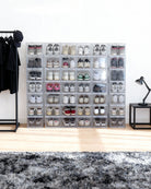Dieses Set enthält drei stapelbare, transparente Sneaker-Boxen mit magnetischem Soft-Close-Verschluss. Sie sind ideal, um in deinem Zuhause für stylische Ordnung zu sorgen.